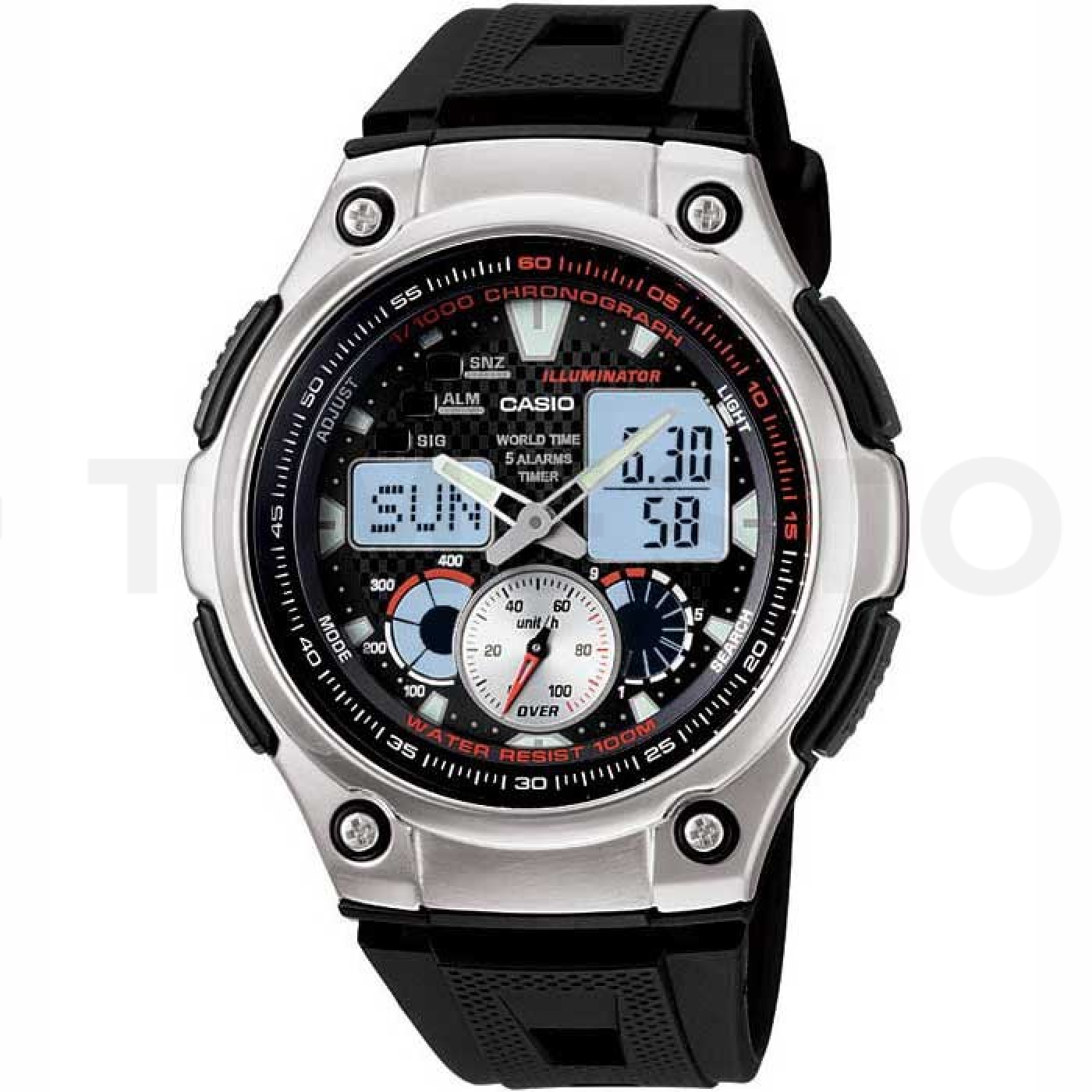 - Chronograph, Roční kalendář, Světový čas, Osvětlení, Alarm, Stopky